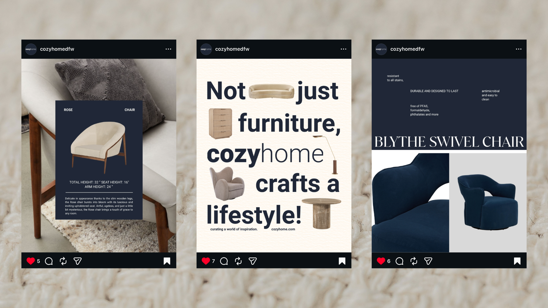 We led end-to-end creative direction and produced styled photo shoots that brought their furniture collections to life with warmth, texture, and aspirational living spaces. From curating mood boards to establishing a unified color palette, typography, and tone of voice, we built a distinctive visual personality for cozyhome.